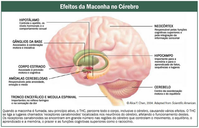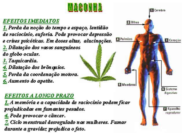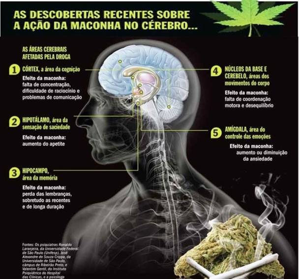 A maconha é uma droga perturbadora do sistema nervoso, ou seja, ela altera o funcionamento normal do cérebro, provocando fenômenos psíquicos do tipo delírios e alucinações.
